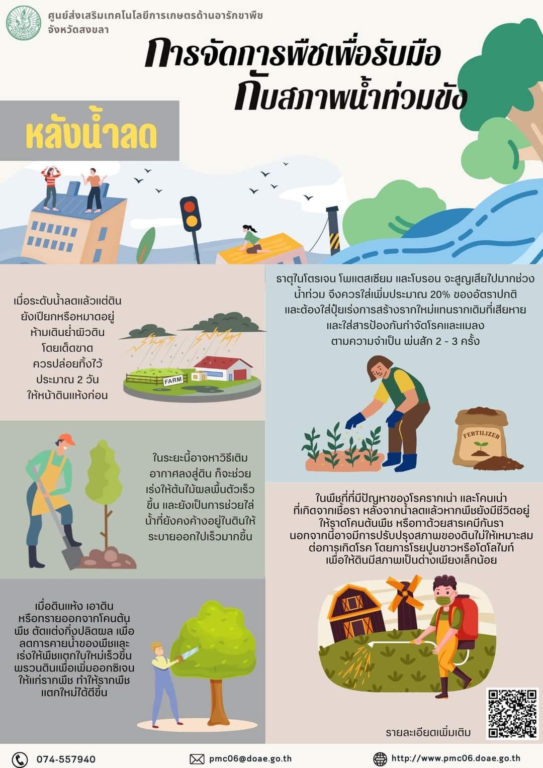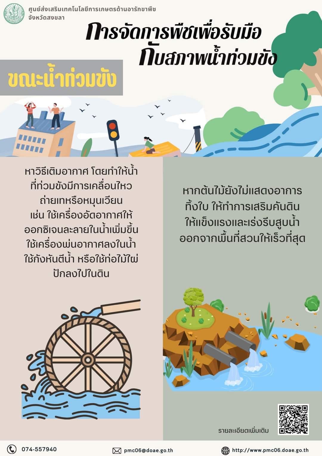 - หากต้นไม้ยังไม่แสดงอาการทิ้งใบ ให้ทำการเสริมคันดินให้แข็งแรงและเร่งรีบสูบน้ำออกจากพื้นที่สวนให้เร็วที่สุด