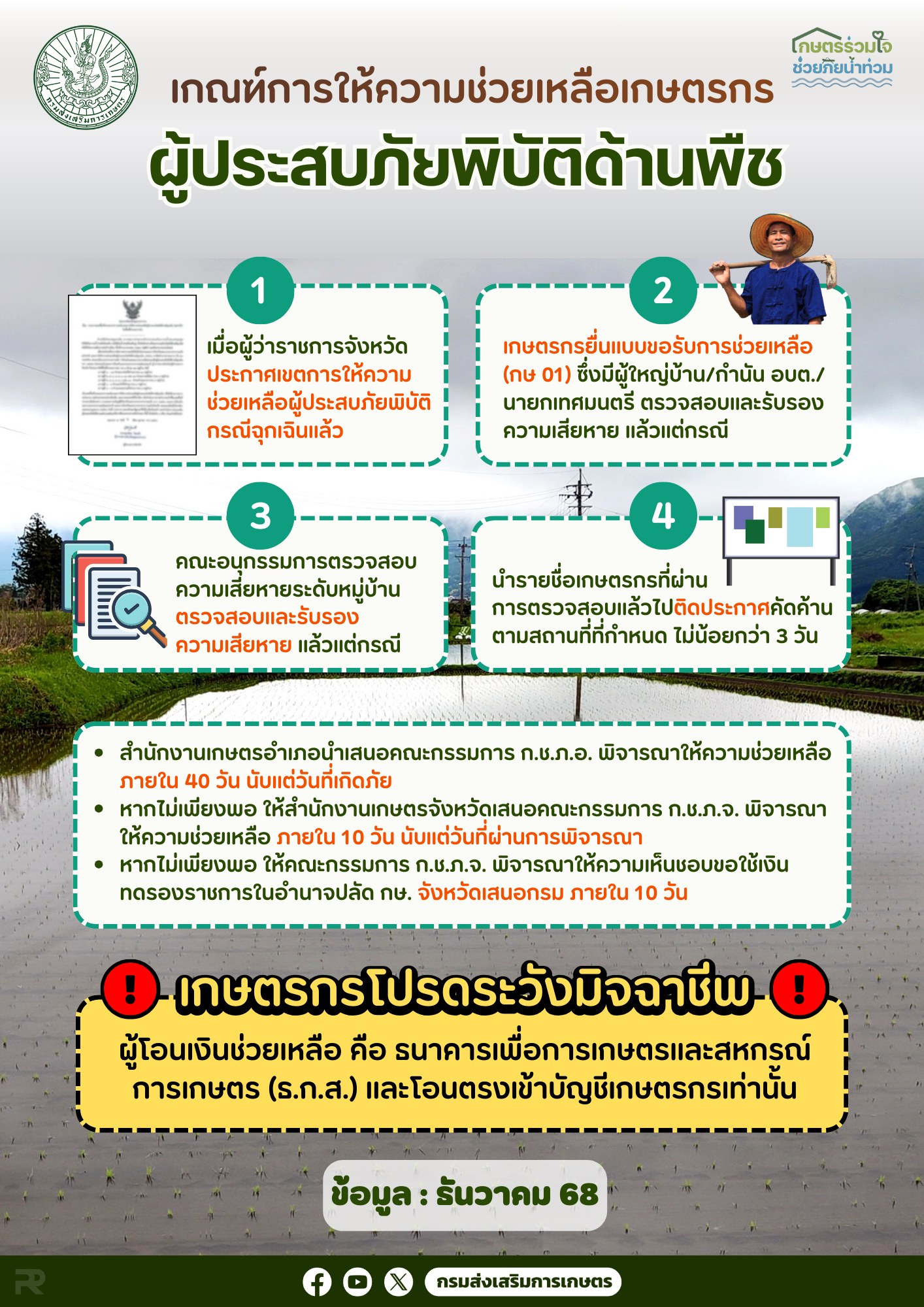 - ผู้โอนเงินช่วยเหลือ คือ ธนาคารเพื่อการเกษตรและสหกรณ์การเกษตร (ธ.ก.ส.) และโอนตรงเข้าบัญชีเกษตรกรเท่านั้น