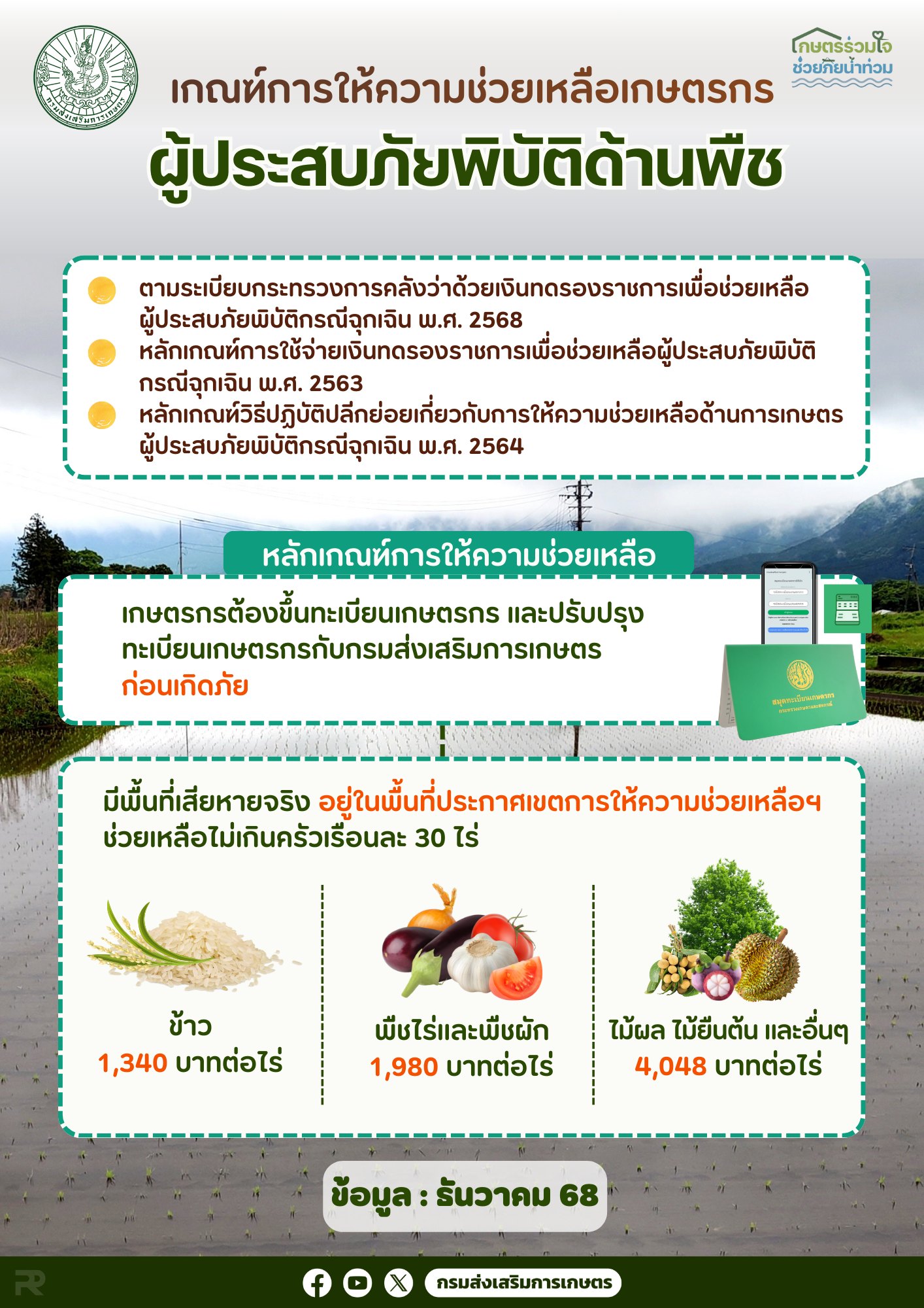 - เกษตรกรต้องขึ้นทะเบียนเกษตรกร และปรับปรุงทะเบียนเกษตรกรกับกรมส่งเสริมการเกษตร ก่อนเกิดภัย