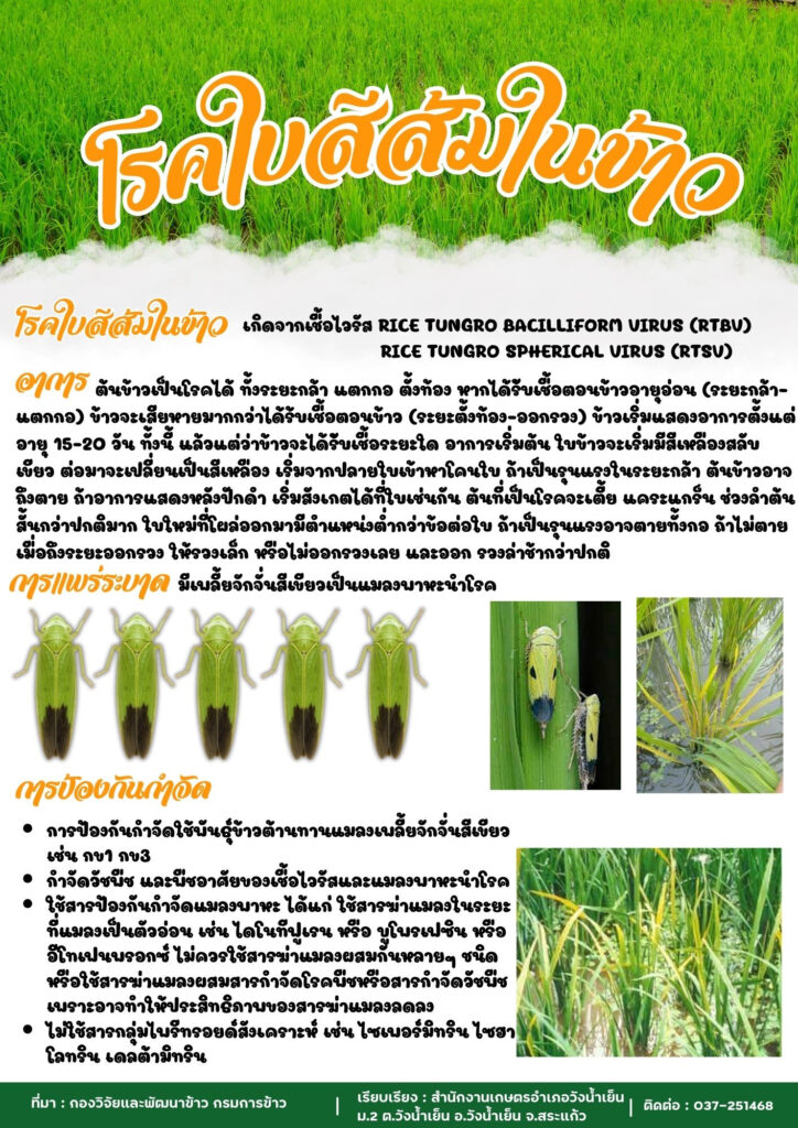 โรคใบสีส้มในข้าว เกิดจากเชื้อไวรัส Rice Tungro Bacilliform Virus (RTBV) และ Rice Tungro Spherical Virus (RTSV)